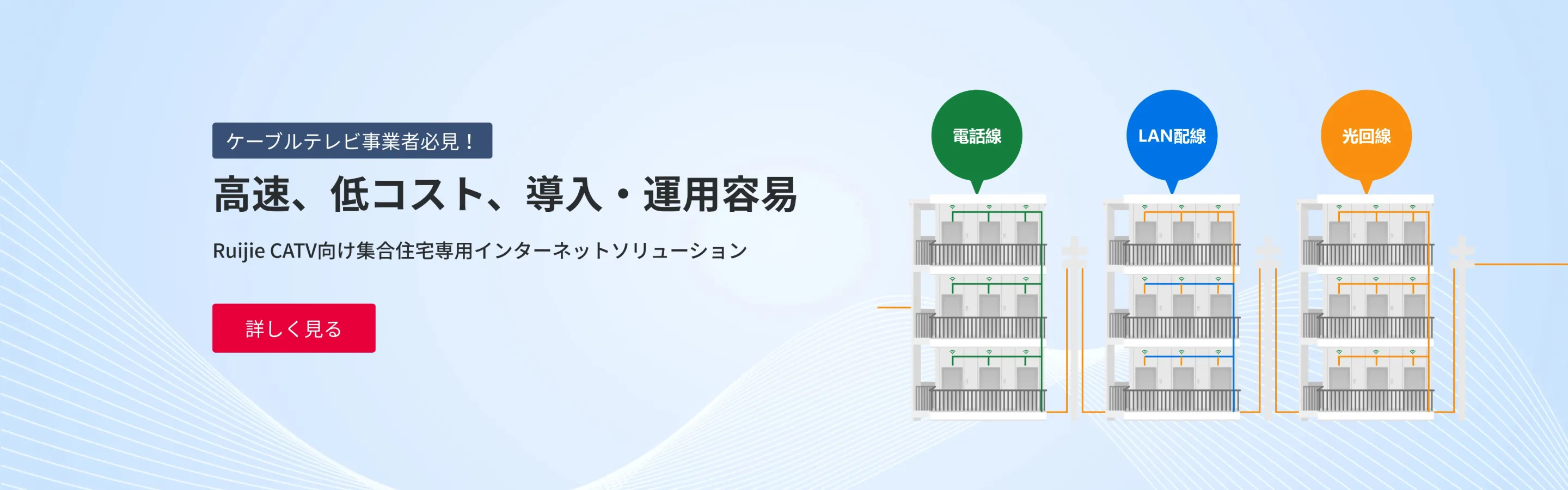 集合住宅の様々なシナリオと配線方式に応じて、低コストで高速なインターネットソリューションをご提供